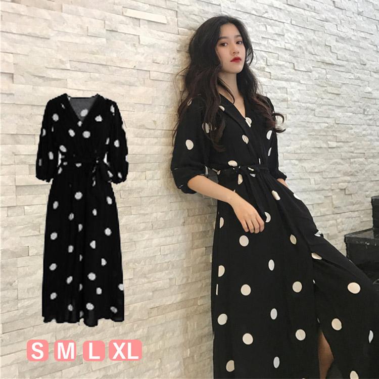 プチプラドット ワンピース レトロ ロング 水玉 ワンピース ドット柄 ワンピ カシュクール Vネック ロングワンピース 通販